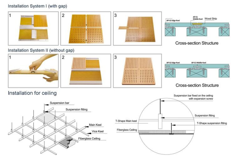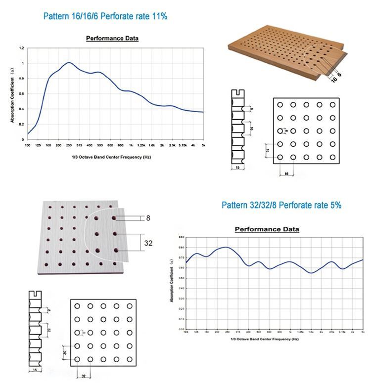 Tá bord ionsú fuaime adhmadach san áireamh bord ionsú fuaime adhmaid groove agus painéal fuaimiúil micrea bréifneach. Is ábhar é bord ionsú fuaime adhmaid groove a athshondas sliotán os comhair an dlúis agus a fhágann an groove ar chúl. Is cineál ábhar ionsúcháin fuaime struchtúir é cumhdach fuaimiúil micrea bréifneach a osclaíonn poll cruinn i dtosach agus i gcúl an bhoird dlúis. Úsáidtear an dá chineál ábhair seo go forleathan ag maisiú metope agus bolgach.